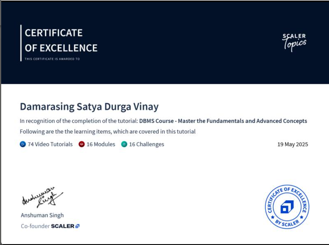 Completed a comprehensive course covering both fundamental and advanced concepts in Database Management Systems (DBMS).