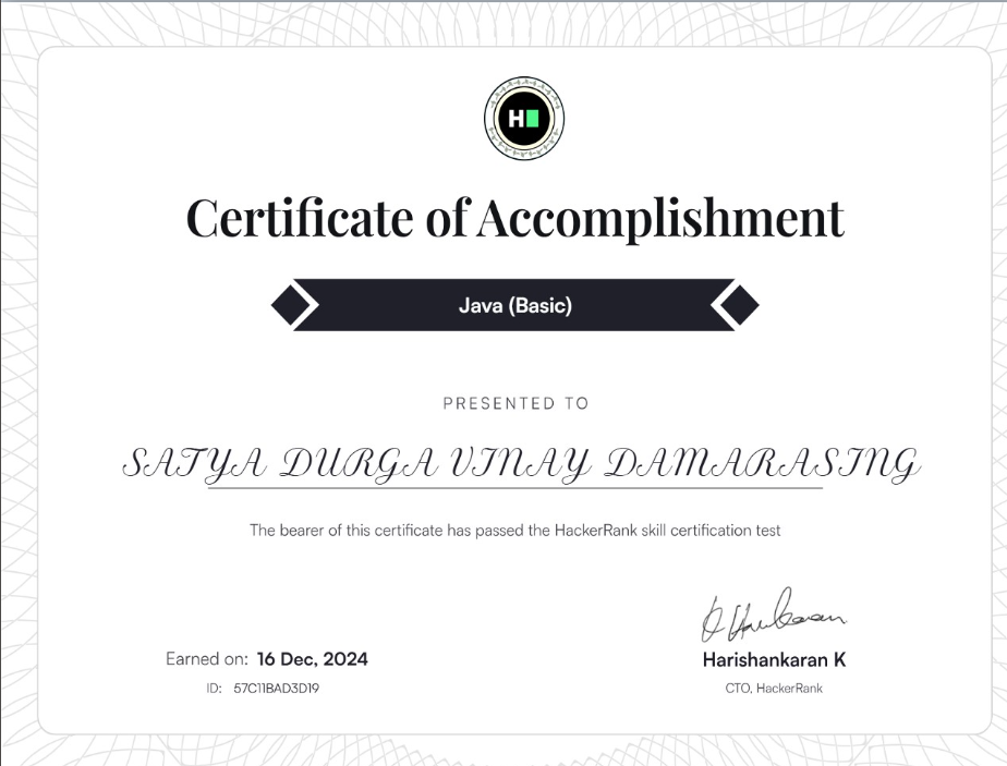 Successfully finished the Java Programming Essentials course from Great Learning, focusing on core Java concepts, OOP, and application development.