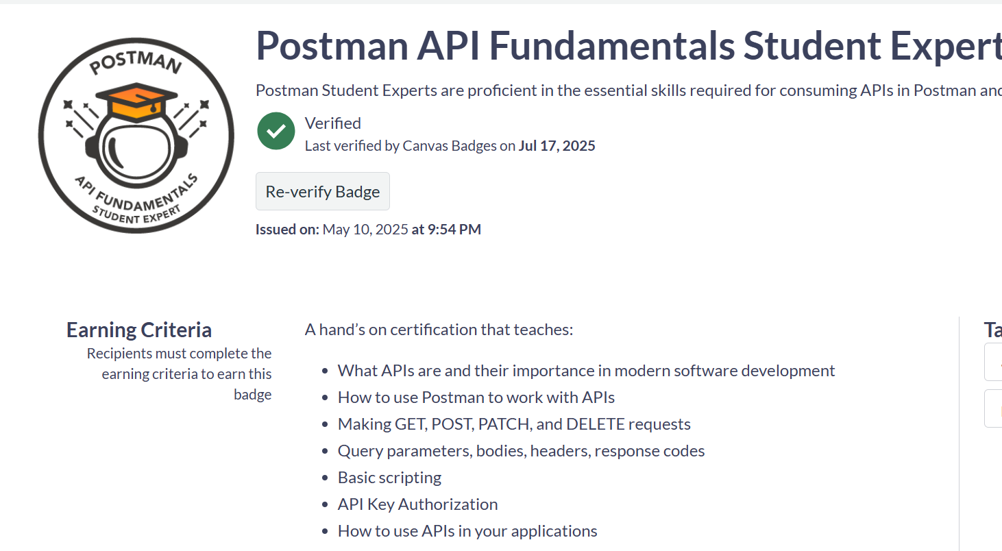 Earned the Postman API Fundamentals Student Expert certification, demonstrating proficiency in API testing and development using Postman.
