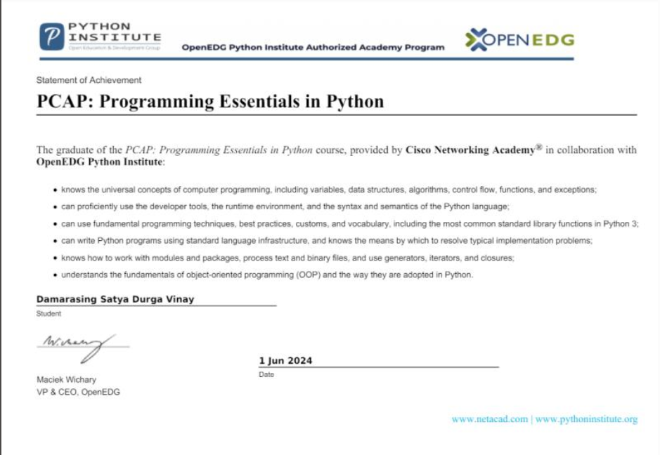 Completed the Python for Beginners course from Great Learning, covering Python basics, data structures, and hands-on programming exercises.