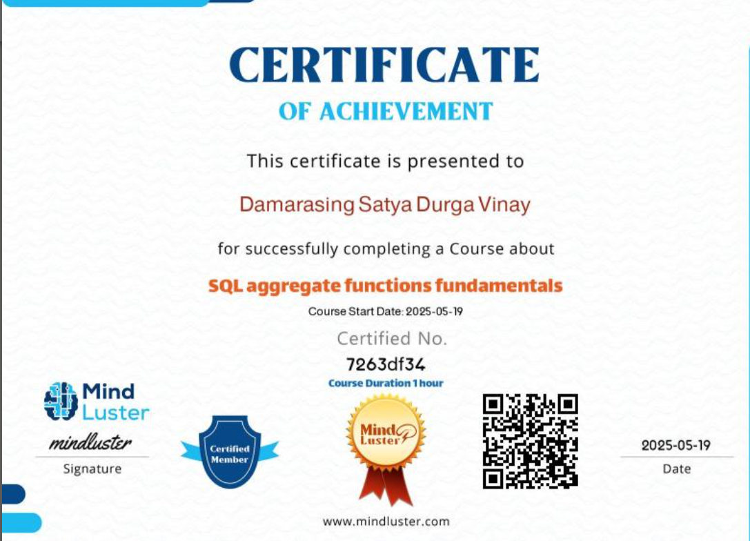 Certified in SQL Aggregate Functions, showcasing strong skills in data aggregation and analysis using SQL.